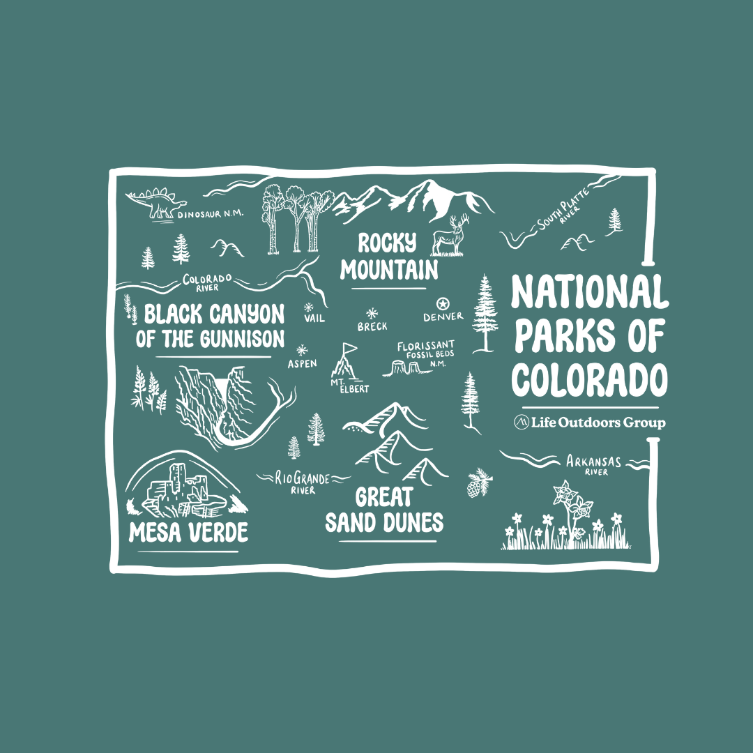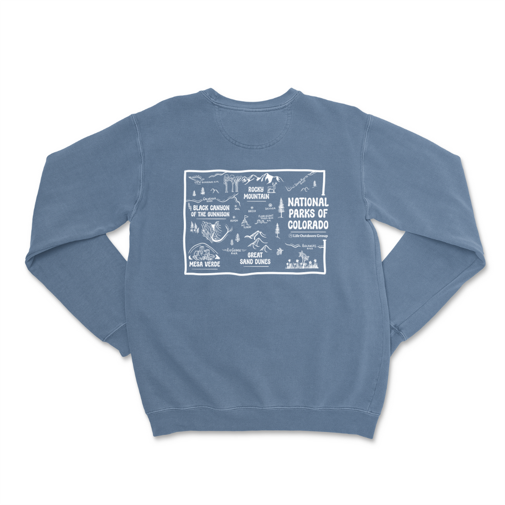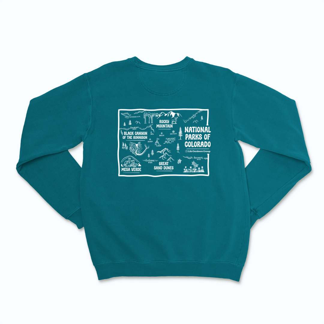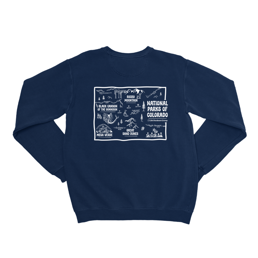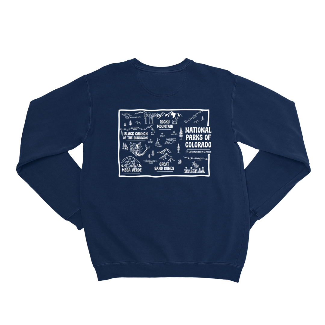 This crewneck sweatshirt features a hand drawn map of Colorado state, showcasing its stunning array of National Parks and unique icons.