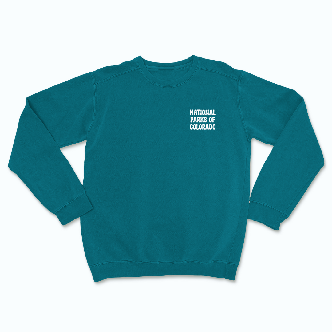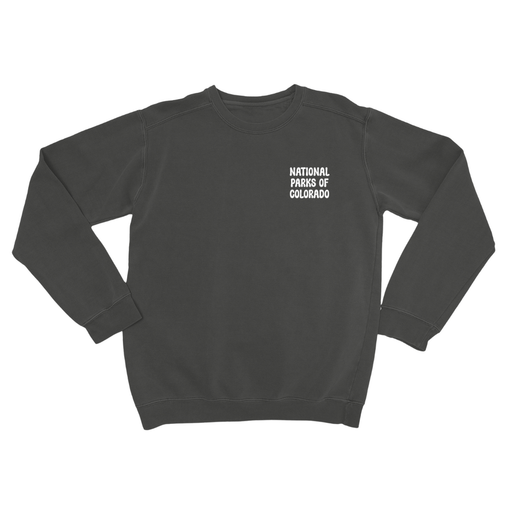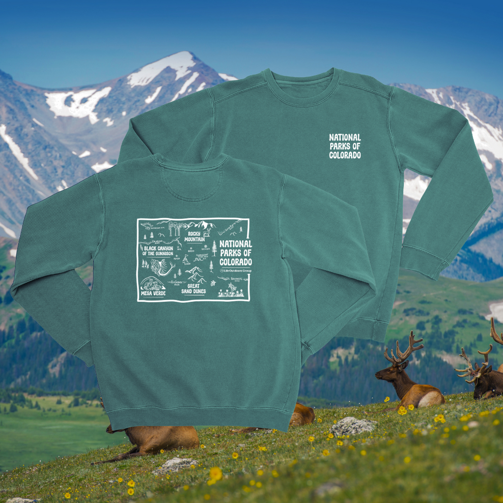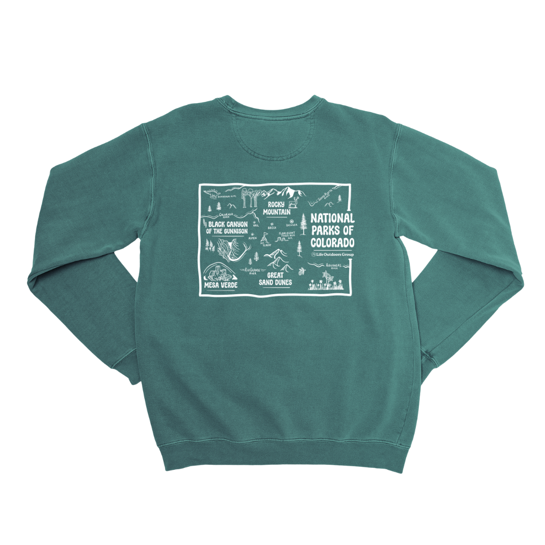 Explore the beauty of the Rocky Mountain State with our vintaged Colorado National Parks Map Sweatshirt.