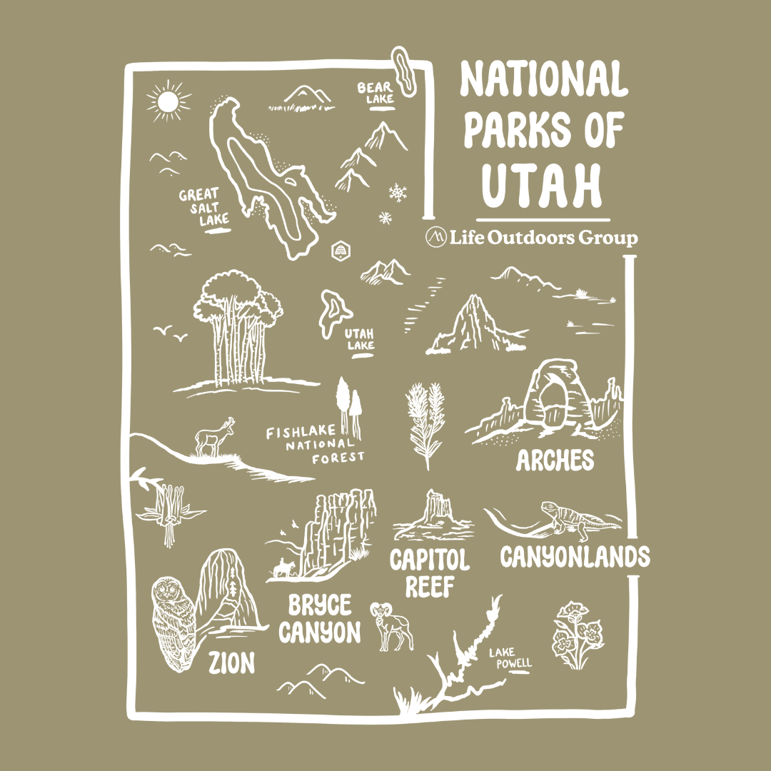 This t-shirt features a hand drawn map of Utah state, showcasing its stunning array of National Parks and unique icons.