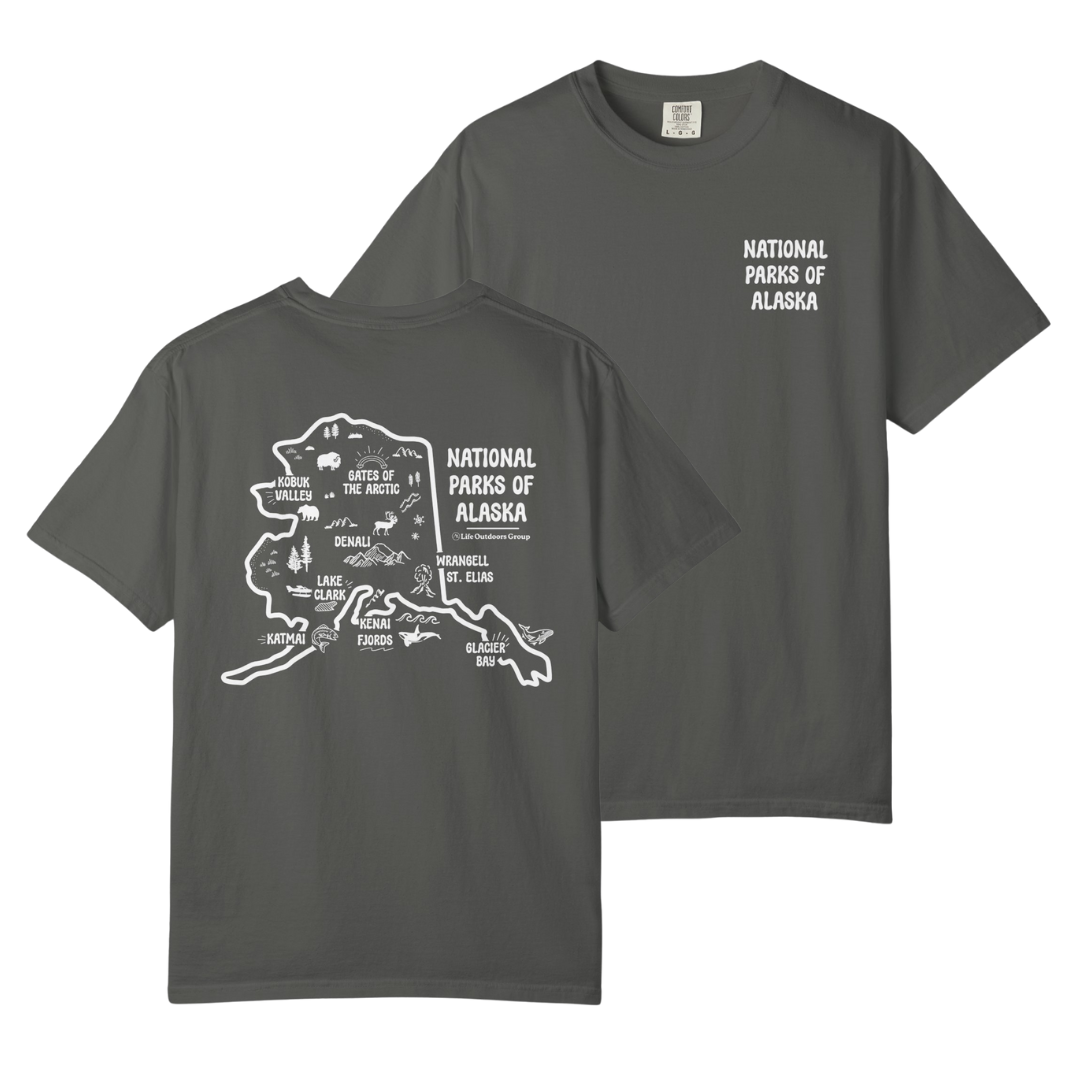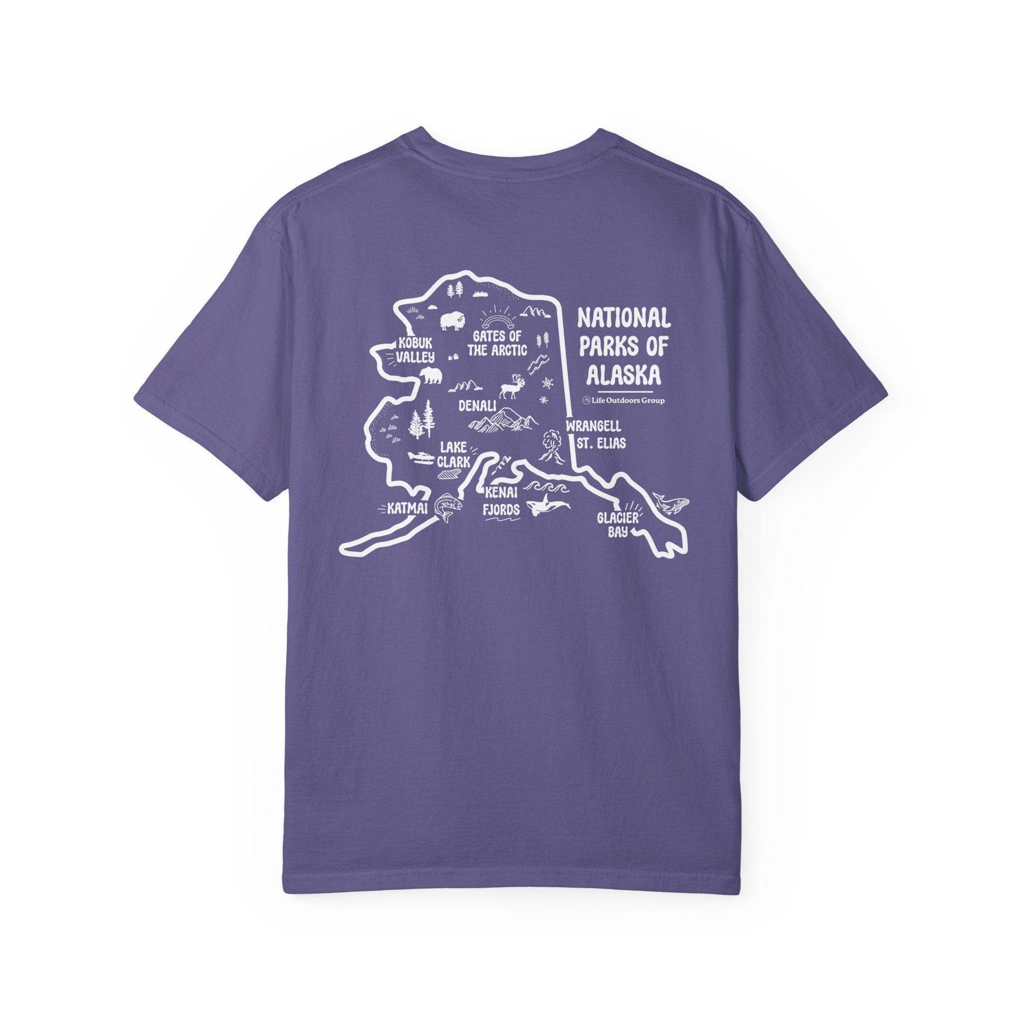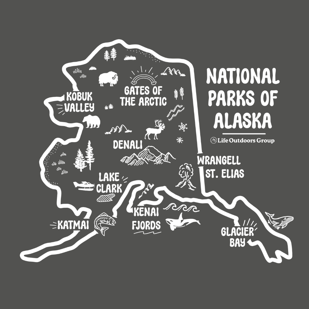 This t-shirt features a hand drawn map of Alaska, showcasing its stunning array of national parks and features.