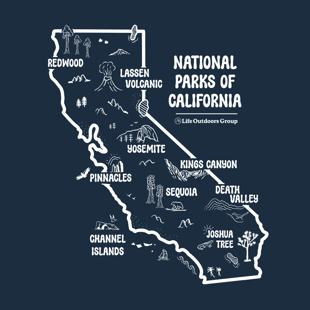 This t-shirt features a hand drawn map of California state, showcasing its stunning array of National Parks and unique icons.