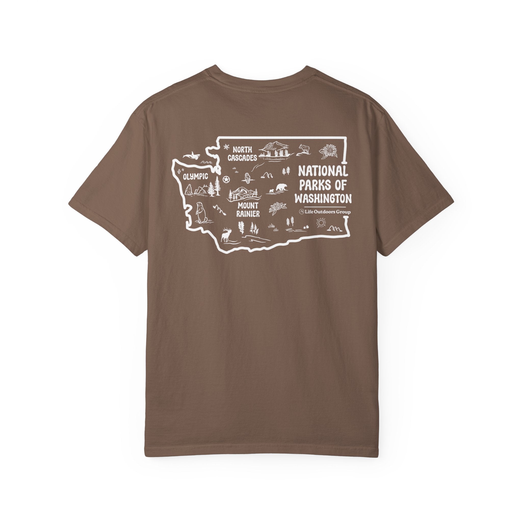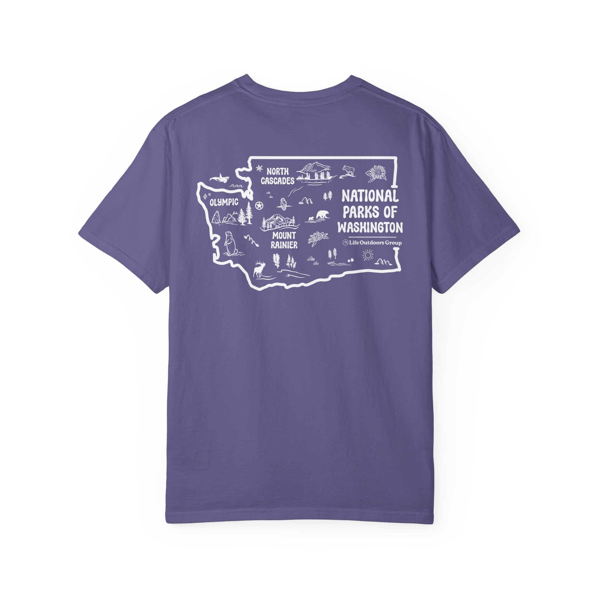 This t-shirt features a hand drawn map of Washington state, showcasing its stunning array of National Parks and unique icons.